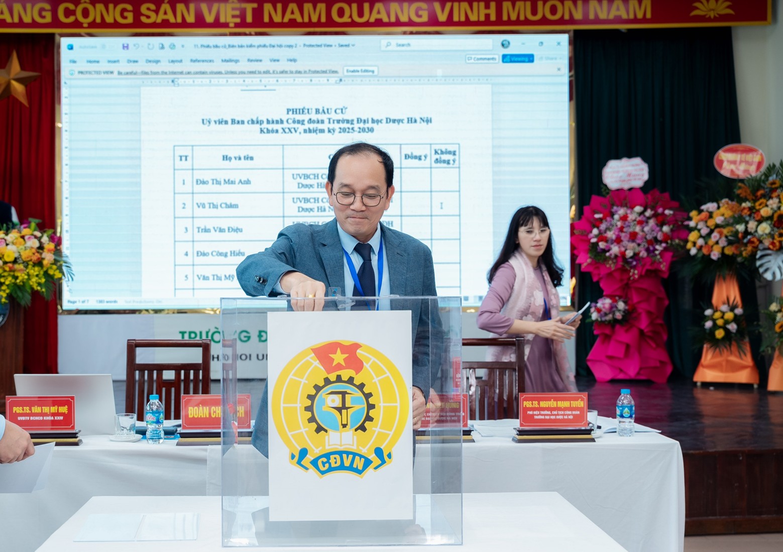 Đại hội đã tiến hành bầu cử Ban chấp hành Công đoàn Trường Đại học Dược Hà Nội khoá XXV và đại biểu dự Đại hội Công đoàn Y tế Việt Nam lần thứ XV. Với sự chuẩn bị nghiêm túc, chất lượng nhân sự, Đại hội đã bầu ra Ban chấp hành khóa XXV gồm 11 đồng chí và 1 Đại biểu dự Đại hội Công đoàn Y tế Việt Nam lần thứ XV. Hội nghị lần thứ nhất Ban chấp hành Công đoàn Trường đã bầu các chức danh chủ chốt của Công đoàn Trường gồm: Chủ tịch – PGS. TS. Nguyễn Mạnh Tuyển, Phó chủ tịch – ThS. Lê Phan Tuấnm UVBTV – PGS. TS. Văn Thị Mỹ Huệ. Đại biểu dự Đại hội Công đoàn Y tế Việt Nam lần thứ XV là đồng chí Lê Phan Tuấn; Ủy Ban Kiểm tra gồm ThS. Lê Phan Tuấn – Chủ nhiệm UBKT, ThS. Lê Thiên Kim và DS. Trần Quốc Trung.