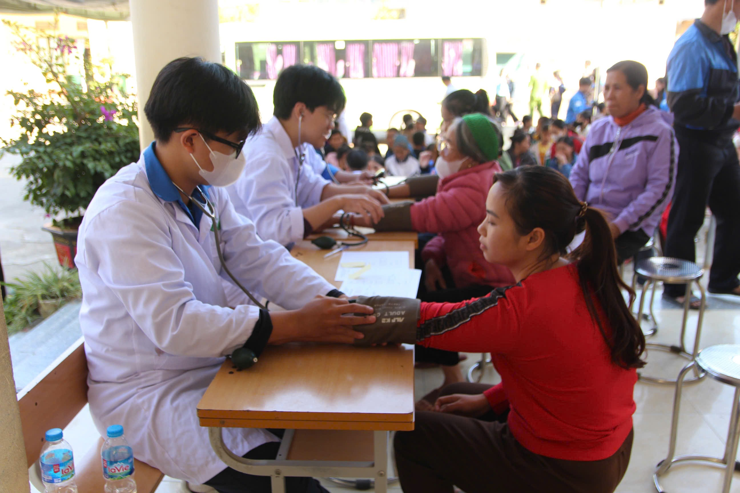 Images of doctors and pharmacists providing medical examinations and humanitarian medicine distribution to the residents of Kien Dai Commune.