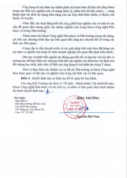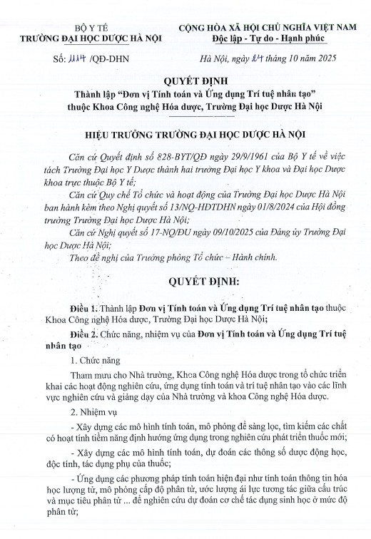 Thực hiện Chiến lược phát triển Khoa học và Công nghệ của Nhà trường, đồng thời triển khai thực hiện Quyết định số 2121/QĐ-BYT của Bộ Y tế ban hành Kế hoạch hành động thực hiện Nghị quyết số 71/NQ-CP của Chính phủ về triển khai Chương trình hành động thực hiện Nghị quyết số 57-NQ/TW của Bộ Chính trị về đột phá phát triển khoa học, công nghệ, đổi mới sáng tạo và chuyển đổi số quốc gia, ngày 24/10/2025, Trường Đại học Dược Hà Nội đã ban hành Quyết định số 1114/QĐ-DHN về việc thành lập “Đơn vị Tính toán và Ứng dụng Trí tuệ nhân tạo” thuộc Khoa Công nghệ Hóa dược.