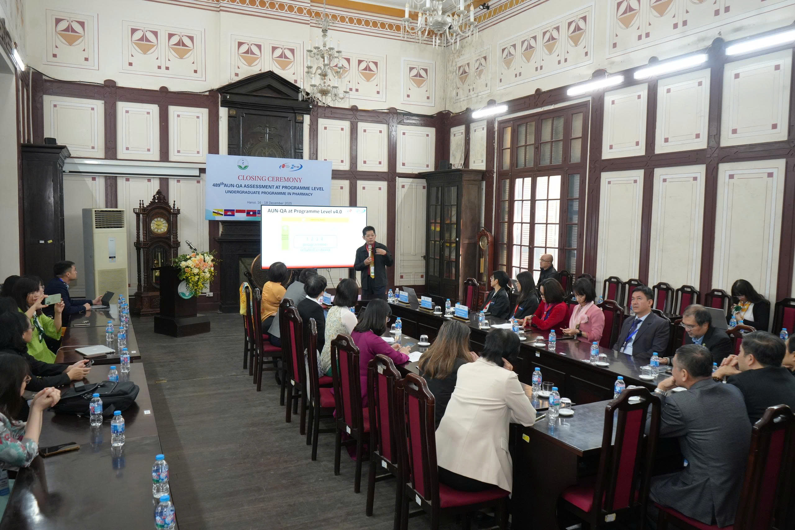 Phiên bế mạc vinh dự có sự hiện diện của đoàn chuyên gia đánh giá quốc tế giàu kinh nghiệm:Assoc. Prof. Dr. Eric Wibisono – Trưởng đoàn đánh giá (Lead Assessor);Asst. Prof. Dr. Sudsuang Yutdhana – Đánh giá viên (Assessor);Ms. Kodchakorn Phaisitsrisawat – Thư ký AUN-QA. Về phía Trường Đại học Dược Hà Nội có PGS.TS. Đinh Thị Thanh Hải và PGS.TS. Nguyễn Mạnh Tuyển – Phó Hiệu trưởng Nhà trường; cùng sự góp mặt của Trưởng các Khoa, Phòng và các cán bộ chủ chốt – những người đã nỗ lực không ngừng nghỉ trong suốt quá trình chuẩn bị công tác tự đánh giá.