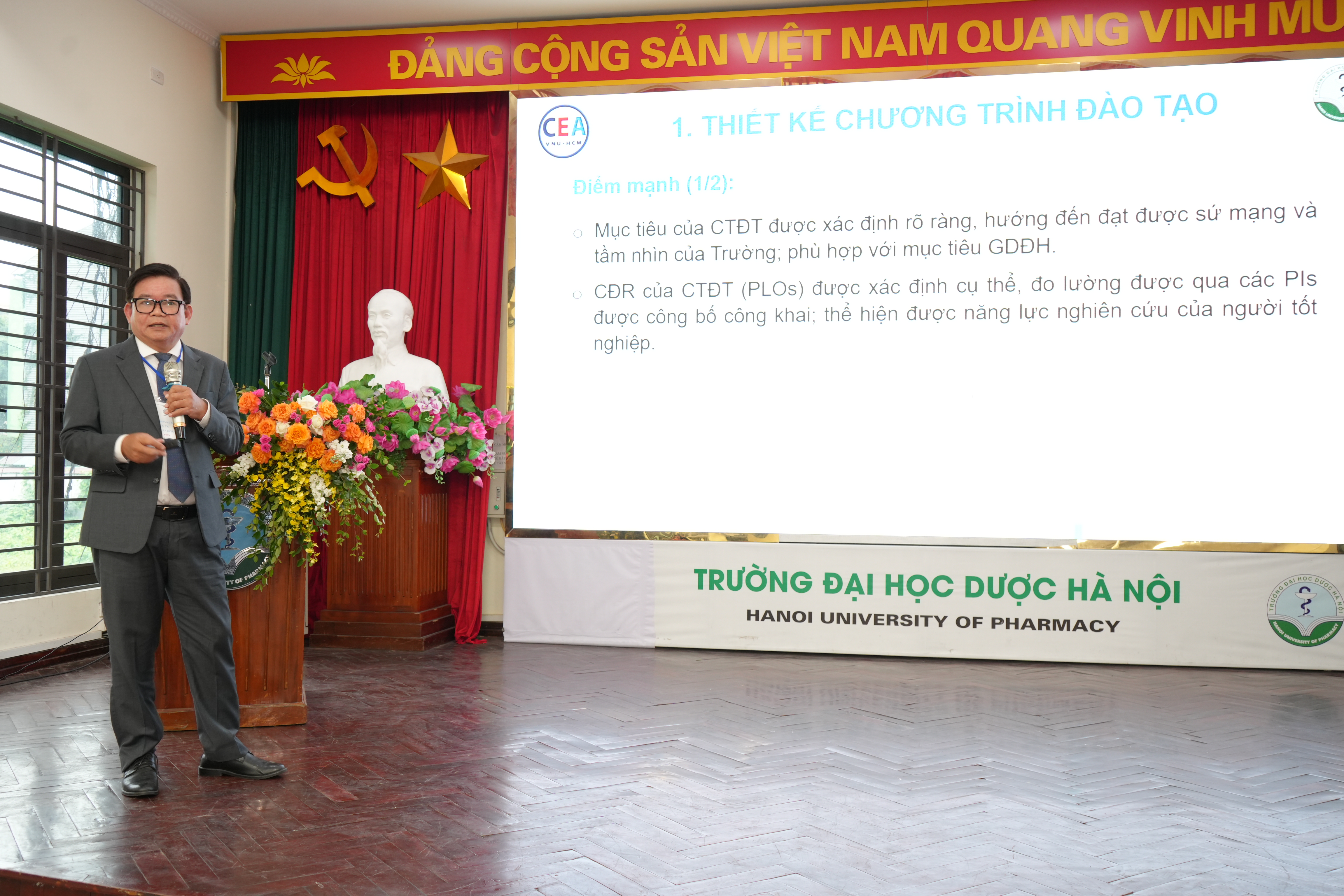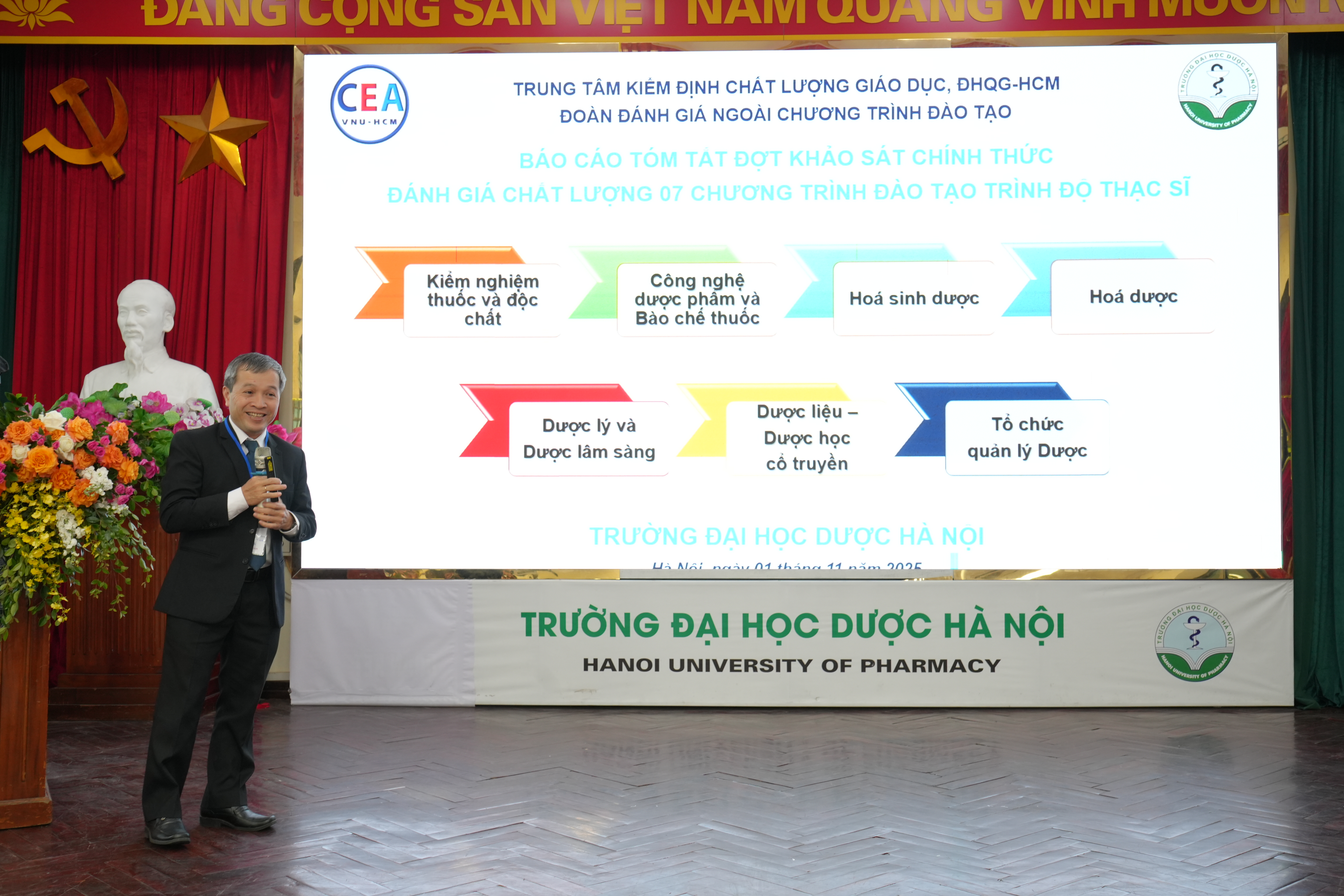 Mở đầu chương trình, PGS.TS. Ngô Văn Thuyên đại diện Đoàn chuyên gia trình bày báo cáo sơ bộ kết quả khảo sát chính thức, nêu bật những thành tựu nổi bật của từng chương trình đào tạo, đồng thời đề xuất những khuyến nghị có tính chiến lược giúp Nhà trường phát huy điểm mạnh và không ngừng cải tiến chất lượng. Các chuyên gia đánh giá ngoài trực tiếp phụ trách đánh giá các chương trình đào tạo đã trình bày báo cáo cụ thể, chi tiết về các nội dung và kết quả đánh giá theo từng tiêu chí, tiêu chuẩn của 07 chương trình đào tạo các ngành: Công nghệ Dược phẩm và Bào chế, Dược liệu – Dược học cổ truyền, Dược lý – Dược lâm sàng, Hóa dược, Hóa sinh Dược, Kiểm nghiệm thuốc – Độc chất, và Tổ chức Quản lý Dược. Các ý kiến đều được đánh giá là mang tính xây dựng, thực tiễn và định hướng dài hạn.