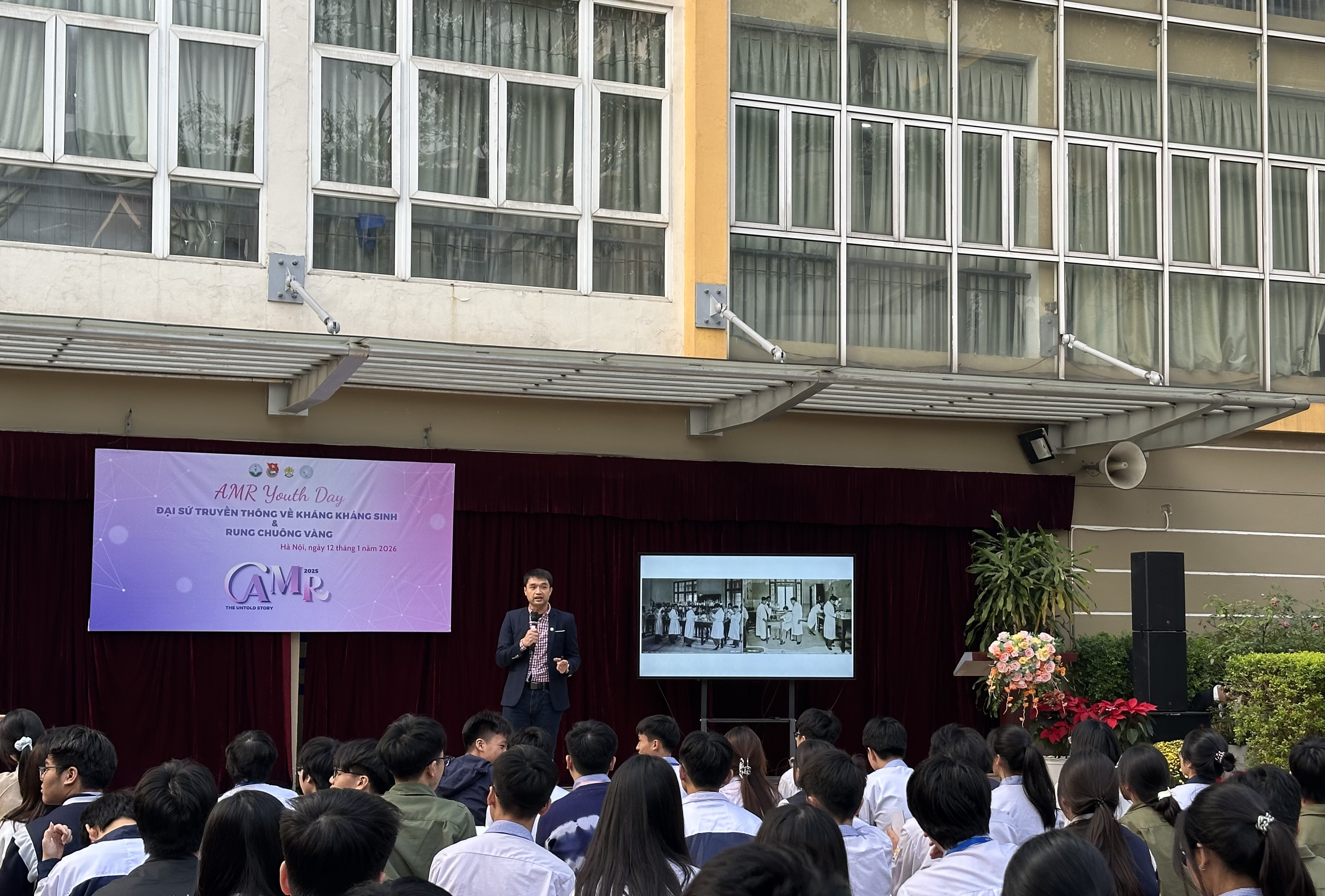 Trong khuôn khổ Dự án AMR – THE UNTOLD STORY 2025 - Chung tay đẩy lùi kháng kháng sinh, chiều ngày 12/01/2026, Đoàn Thanh niên Trường Đại học Dược Hà Nội đã phối hợp với Trường THPT Kim Liên tổ chức thành công Cuộc thi “Đại sứ truyền thông kháng kháng sinh” và Cuộc thi “Rung chuông vàng” dành cho hơn 1000 học sinh Trường THPT Kim Liên.