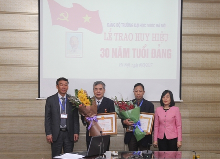 Thừa ủy quyền của Ban Thường vụ Thành ủy Hà Nội, đồng chí Nguyễn Tố Quyên - Phó Bí thư Đảng ủy Khối, đồng chí Nguyễn Đăng Hòa, Bí thư Đảng ủy Nhà trường đã trao Huy hiệu 30 năm tuổi Đảng và tặng hoa chúc mừng cho đồng chí Nguyễn Quốc Quân & đồng chí Trần Trịnh Công.