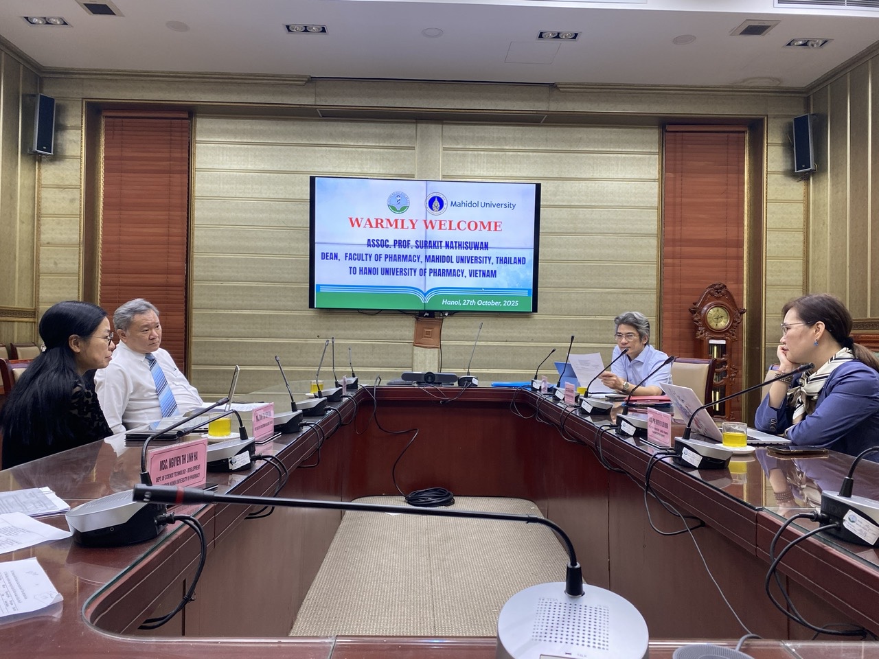 Tại buổi làm việc, hai bên đã trao đổi và thống nhất nhiều nội dung quan trọng liên quan đến Hội thảo “Dịch vụ Dược và Mô hình Đào tạo Thực hành Lâm sàng tại cơ sở”, đồng thời chia sẻ thông tin về các chương trình, dự án đang triển khai tại Khoa Dược, Đại học Mahidol. Hai trường cũng thảo luận về cơ hội hợp tác trong đào tạo đại học, sau đại học, và nghiên cứu khoa học, hướng tới xây dựng mối quan hệ hợp tác bền vững và hiệu quả hơn trong tương lai.
