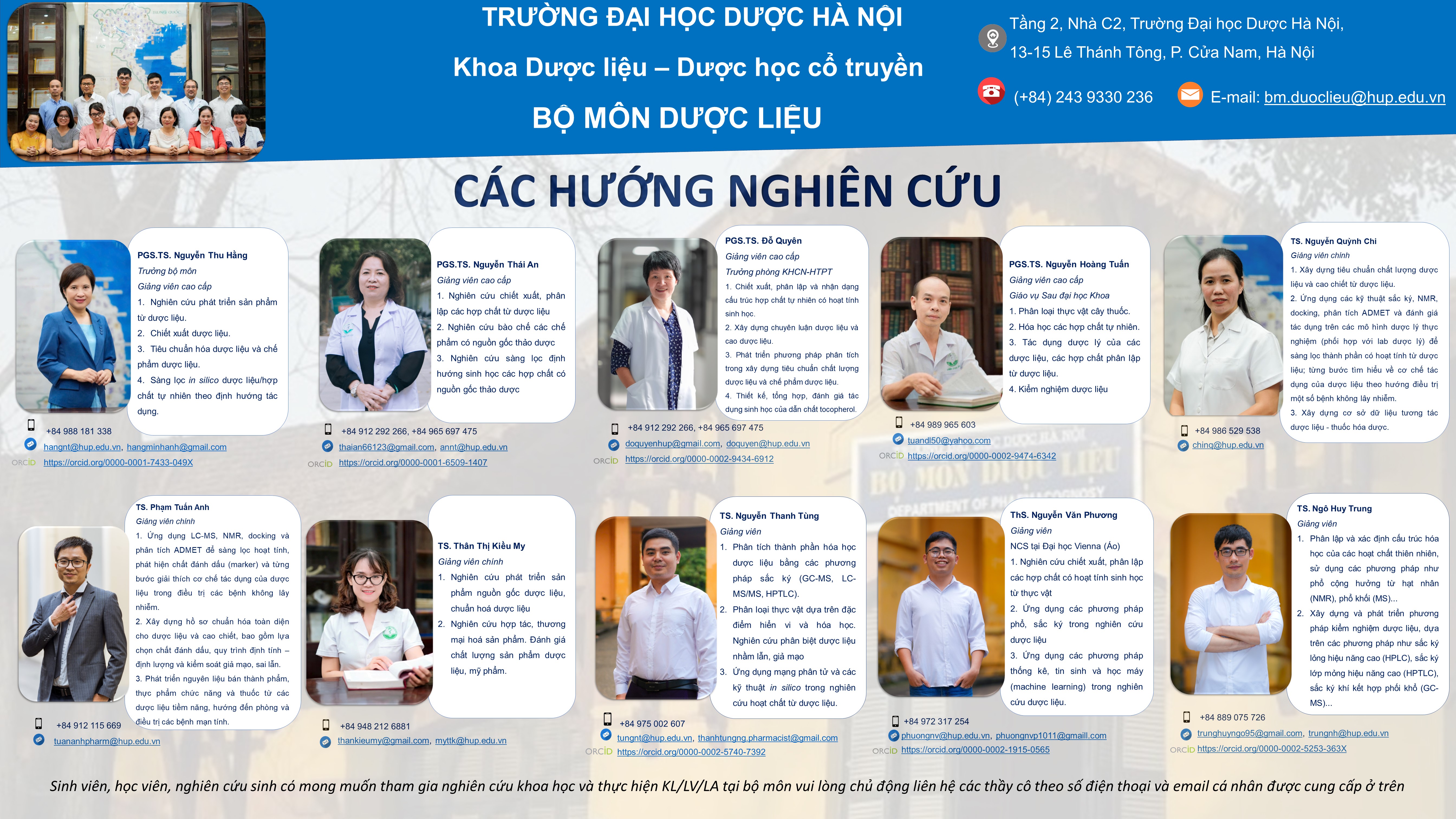 Bước 1. Đọc thông tin về Hướng nghiên cứu của mỗi thầy/cô trong ảnh/file gửi kèm hoặc tại bảng tin của Bộ môn Dược liệu.