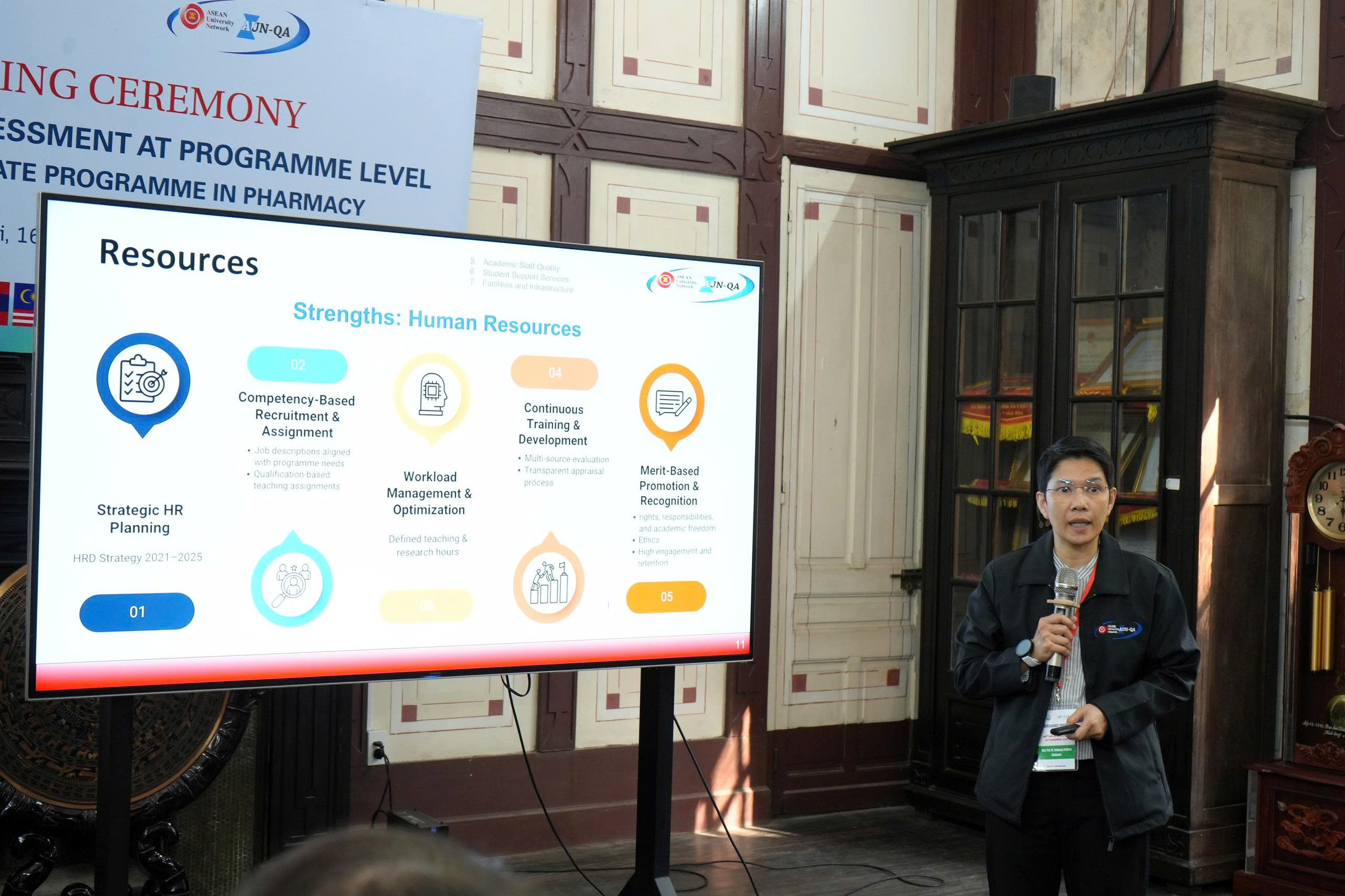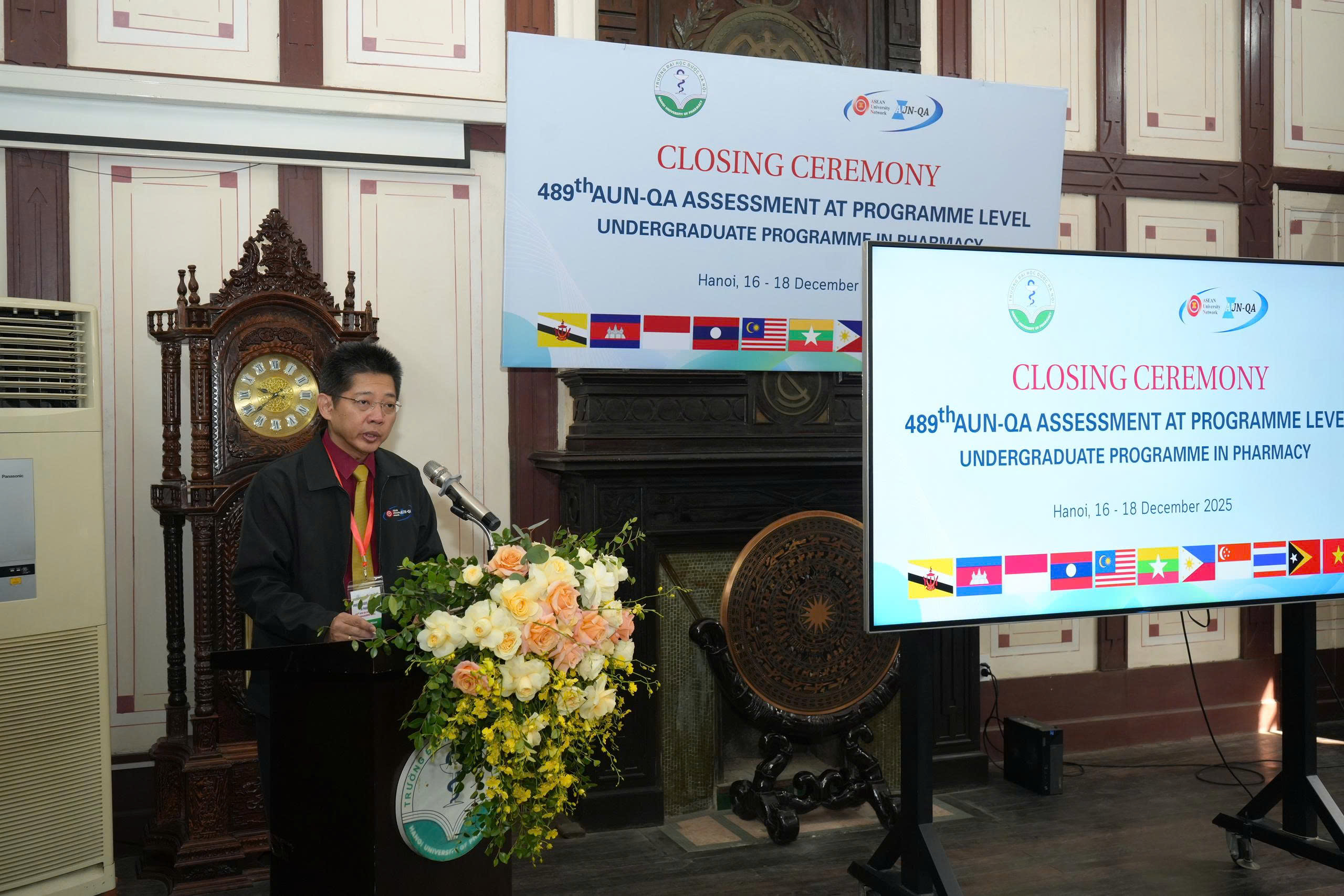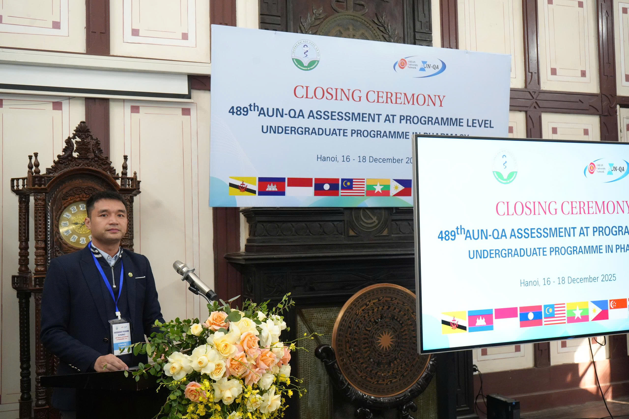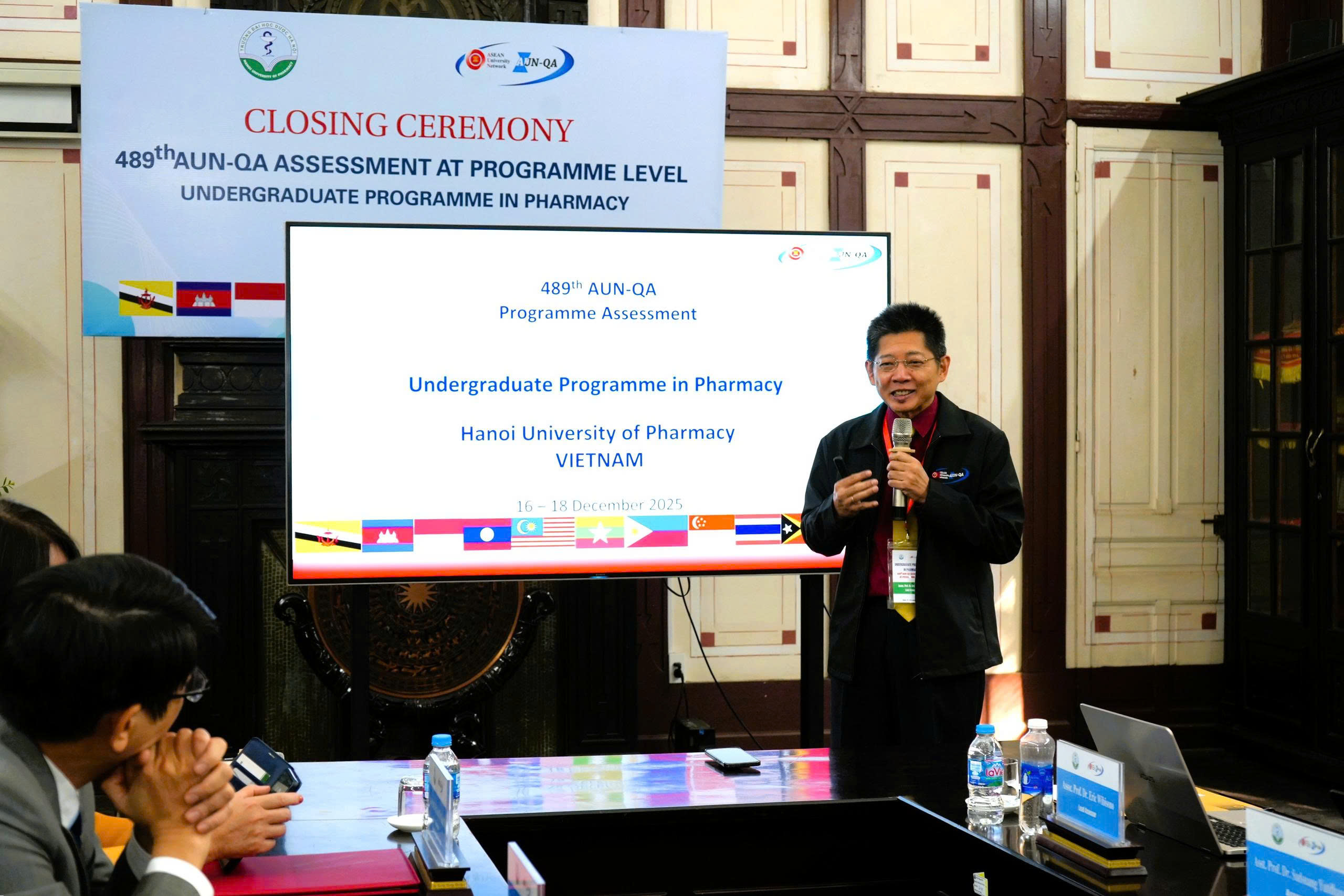 Phiên bế mạc vinh dự có sự hiện diện của đoàn chuyên gia đánh giá quốc tế giàu kinh nghiệm:Assoc. Prof. Dr. Eric Wibisono – Trưởng đoàn đánh giá (Lead Assessor);Asst. Prof. Dr. Sudsuang Yutdhana – Đánh giá viên (Assessor);Ms. Kodchakorn Phaisitsrisawat – Thư ký AUN-QA. Về phía Trường Đại học Dược Hà Nội có PGS.TS. Đinh Thị Thanh Hải và PGS.TS. Nguyễn Mạnh Tuyển – Phó Hiệu trưởng Nhà trường; cùng sự góp mặt của Trưởng các Khoa, Phòng và các cán bộ chủ chốt – những người đã nỗ lực không ngừng nghỉ trong suốt quá trình chuẩn bị công tác tự đánh giá.