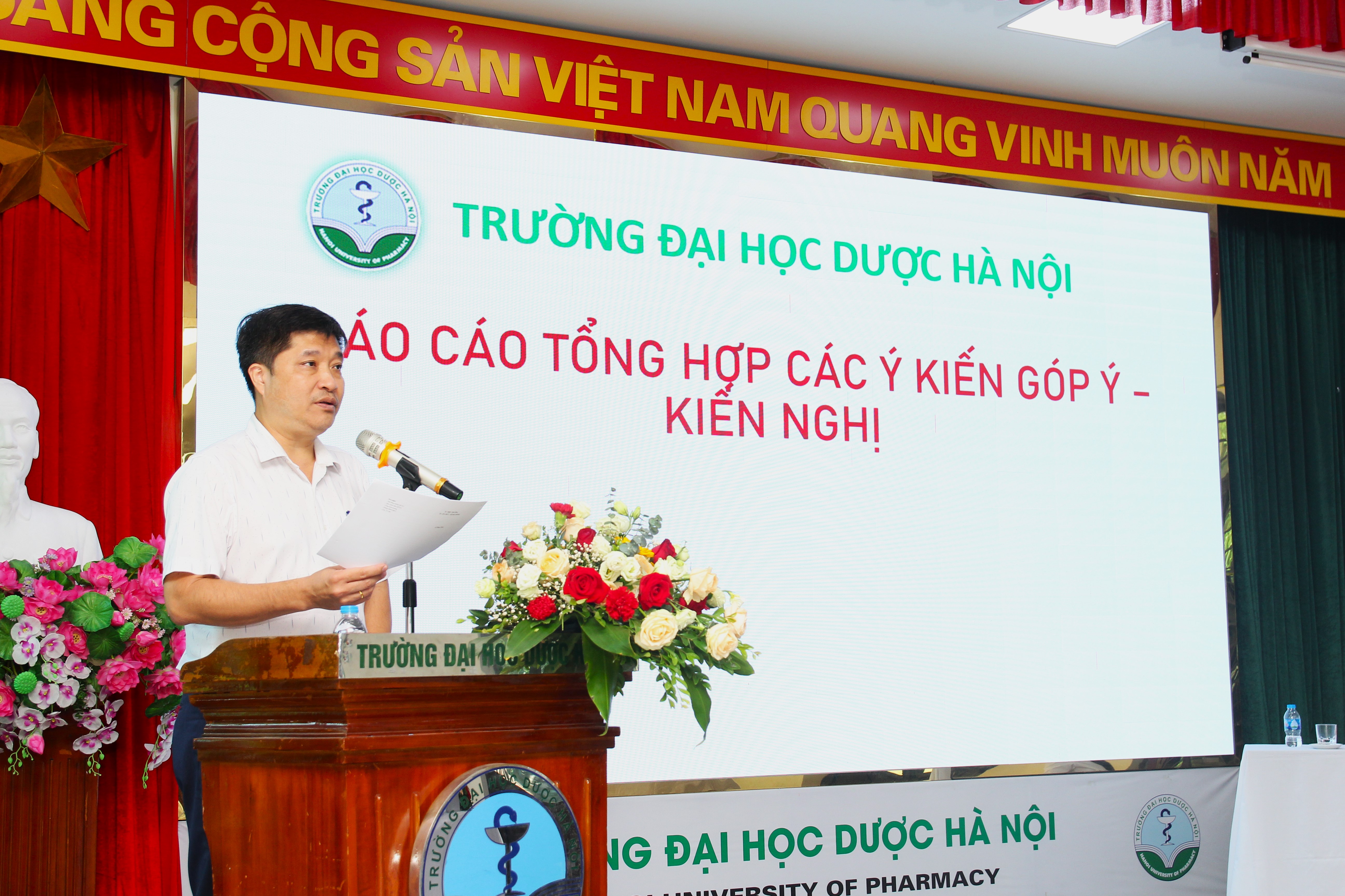 Mở đầu Hội nghị, GS.TS Nguyễn Hải Nam- Hiệu trưởng Nhà trường đã Báo cáo tổng kết năm học 2021-2022, kết quả thực hiện Nghị quyết Hội nghị VC, NLĐ năm 2021 và phương hướng năm học 2022-2023. ThS. Lê Phan Tuấn - Phó Chủ tịch Công đoàn Trường báo cáo tổng hợp ý kiến đóng góp của các đơn vị cho Dự thảo báo cáo của Hội nghị. PGS.TS. Nguyễn Mạnh Tuyển, Chủ tịch công đoàn Trường đã trình bày Báo cáo đánh giá tình hình thực hiện Nghị quyết Hội nghị VC, NLĐ năm 2021 của Ban Chấp hành Công đoàn, Sơ kết phong trào thi đua 6 tháng đầu năm 2022. Thay mặt Công đoàn cấp trên, đồng chí Phạm Thanh Bình – Chủ tịch Công đoàn Y tế Việt Nam đã chúc mừng những kết quả mà Trường, Công đoàn Trường đã đạt được trong năm học 2021-2022 và hy vọng trong thời gian tới Trường Đại học Dược Hà Nội sẽ tiếp tục phát huy những mặt mạnh và khắc phục được những điểm tồn tại, phối hợp tốt hơn nữa giữa Chính quyền với Công đoàn để xây dựng Trường ngày một vững mạnh.