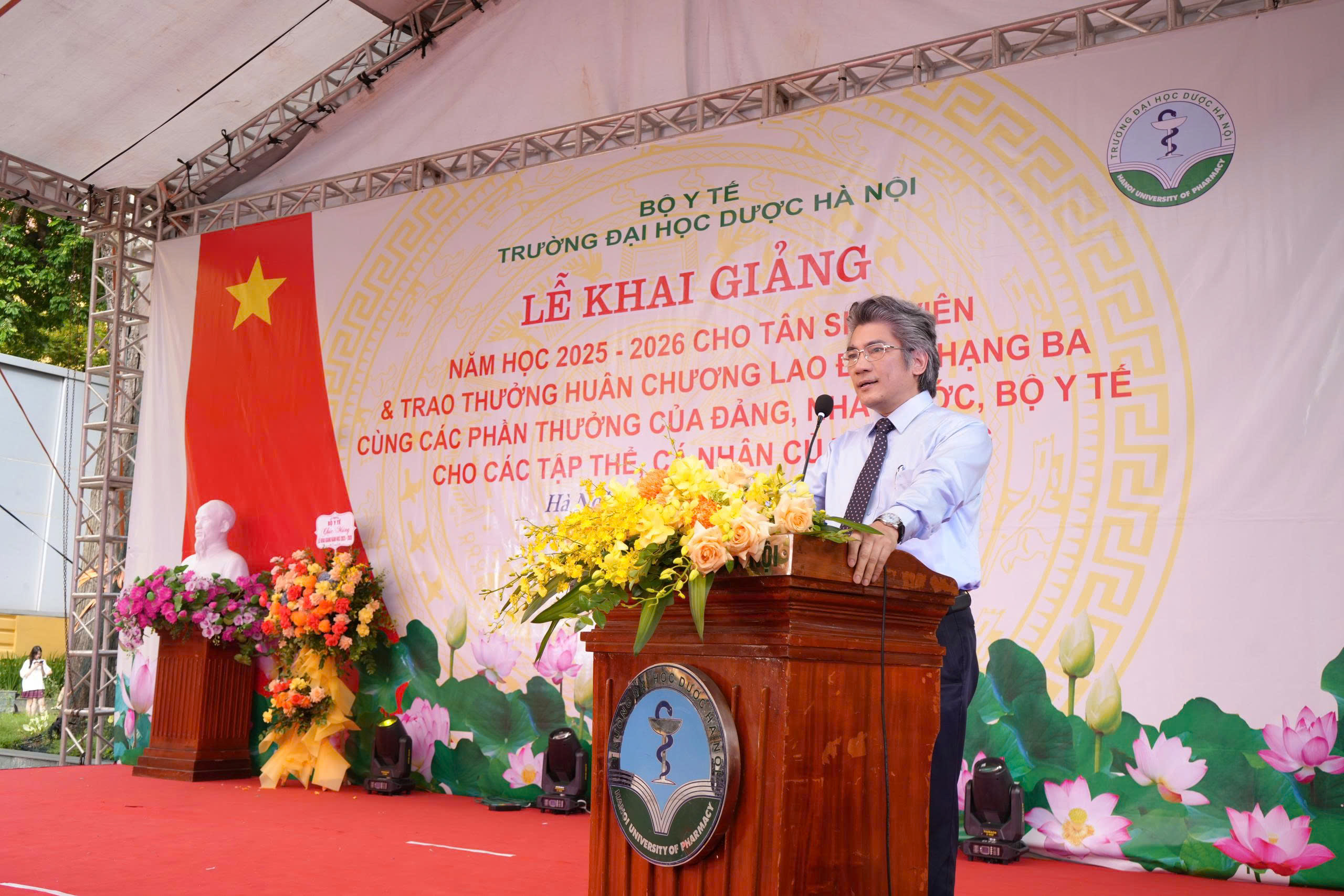 Thay mặt cho lãnh đạo Nhà trường, GS.TS. Nguyễn Hải Nam – Hiệu trưởng bày tỏ niềm vui mừng phấn khởi khi được chào đón 904 tân sinh viên gia nhập cộng đồng HUP. Thầy nhấn mạnh rằng, Trường Đại học Dược Hà Nội không chỉ là nơi các em sinh viên tiếp thu tri thức chuyên môn mà còn là môi trường giúp các em phát triển toàn diện về kỹ năng và tư duy, chuẩn bị hành trang cho những chặng đường vinh quang nhưng không ít khó khăn, thách thức trong tương lai.