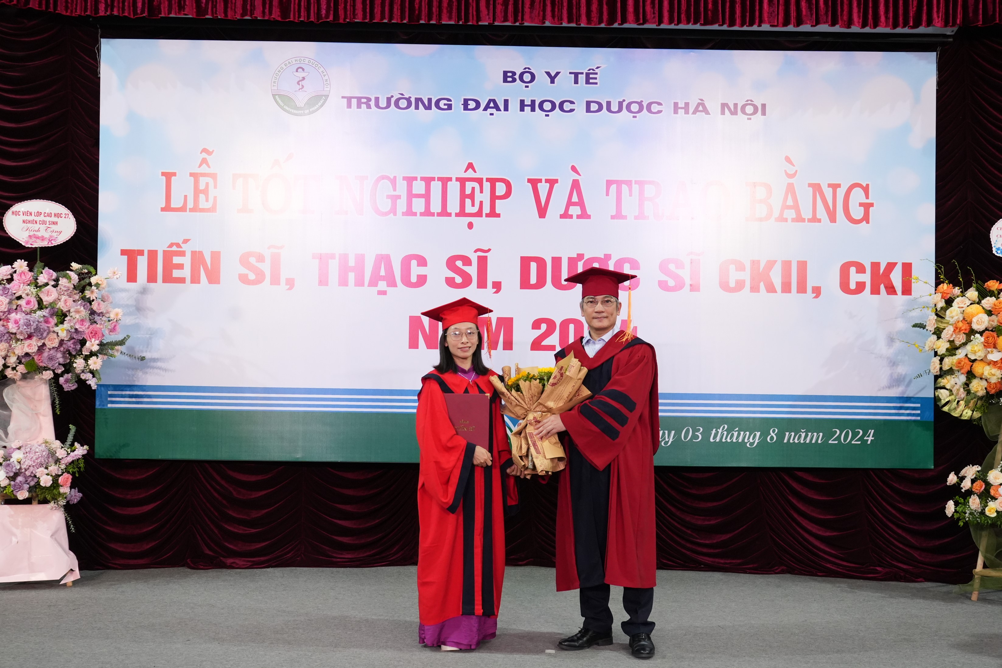 Chiều ngày 03 tháng 8 năm 2024, tại Hội trường Ngụy Như Kon Tum, Trường Đại học Dược Hà Nội đã trang trọng tổ chức Lễ tốt nghiệp và trao Bằng Tiến sĩ, Thạc sĩ, CKII, CKI cho các học viên sau đại học được công nhận tốt nghiệp năm 2024. Tham dự buổi Lễ có TS. Đặng Việt Hùng- Bí thư Đảng ủy, Chủ tịch Hội đồng trường; GS.TS Nguyễn Hải Nam- Hiệu Trưởng Nhà trường; PGS.TS Đinh Thị Thanh Hải- Phó Hiệu Trưởng; PGS.TS. Nguyễn Mạnh Tuyển, Phó Hiệu trưởng, Thạc sĩ Phạm Văn Quyến- Phó Hiệu Trưởng; các thầy Nguyên Hiệu trưởng Nhà trường, các đồng chí trong Đảng ủy, Hội đồng trường, Ban Giám hiệu, Trưởng/Phụ trách các đơn vị cùng các tân khoa sau đại học được trao Bằng tốt nghiệp năm 2024.