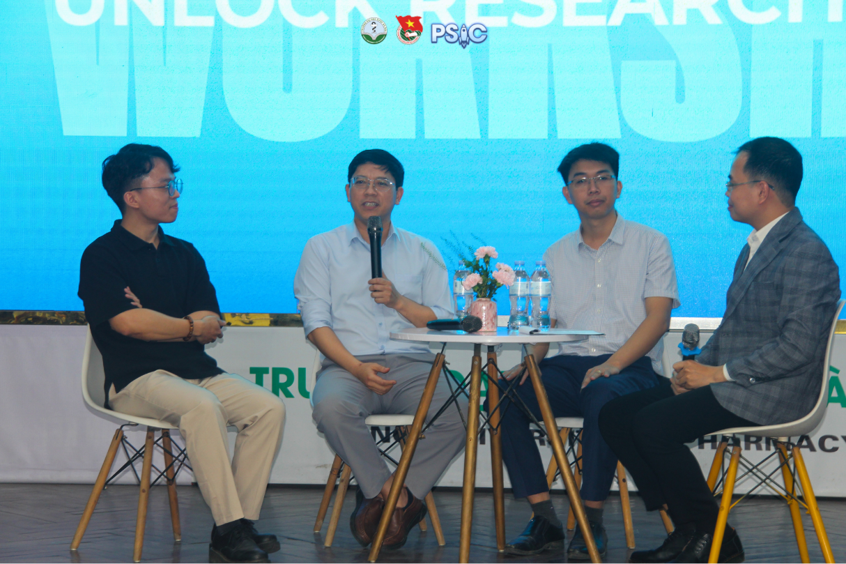 Tiếp nối chương trình, phần tọa đàm với sự dẫn dắt của ThS. Phạm Văn Hùng cùng sự tham gia của các cựu sinh viên tiêu biểu đã tạo nên điểm nhấn nổi bật. Trong không khí gần gũi, cởi mở và giàu tính tương tác, các diễn giả đã chia sẻ hành trình nghiên cứu của bản thân, những khó khăn trong quá trình thực hiện đề tài cũng như những giá trị thiết thực mà NCKH mang lại trong học tập và công việc sau khi ra trường. Những câu chuyện thực tế, đa dạng từ nhiều lĩnh vực đã giúp sinh viên có cái nhìn toàn diện hơn về vai trò của nghiên cứu khoa học trong ngành Dược.